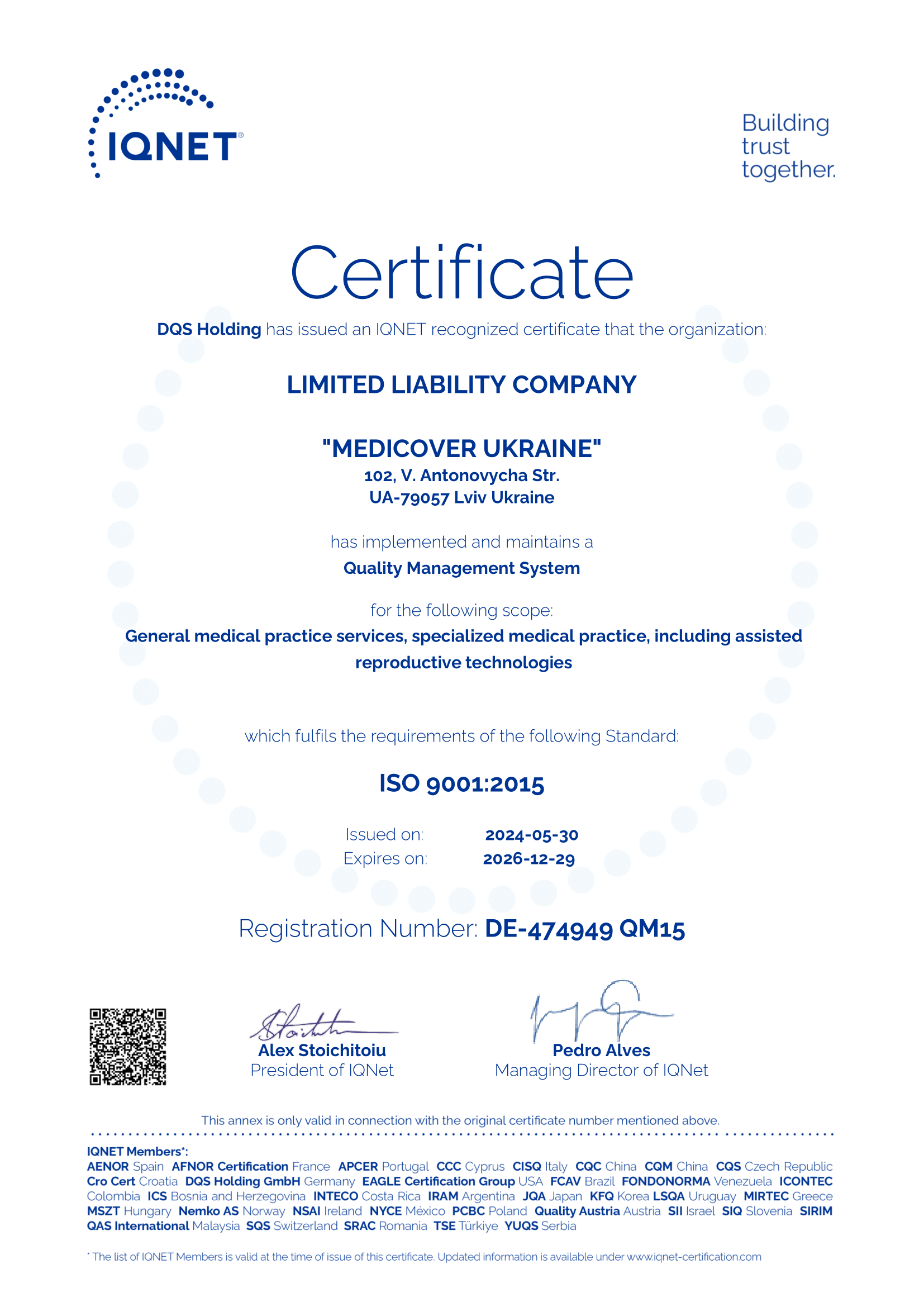 Функціонування системи управління якістю ТОВ «Медікавер Україна» підтверджено міжнародними організаціями зі стандартизації DQS та IQNet відповідно вимогам стандарту ISO 9001: 2015 «Система управління якістю», що забезпечує абсолютну якість надання послуг. Це перевірений та найбільш впізнаваний стандарт управління організацією у світі.